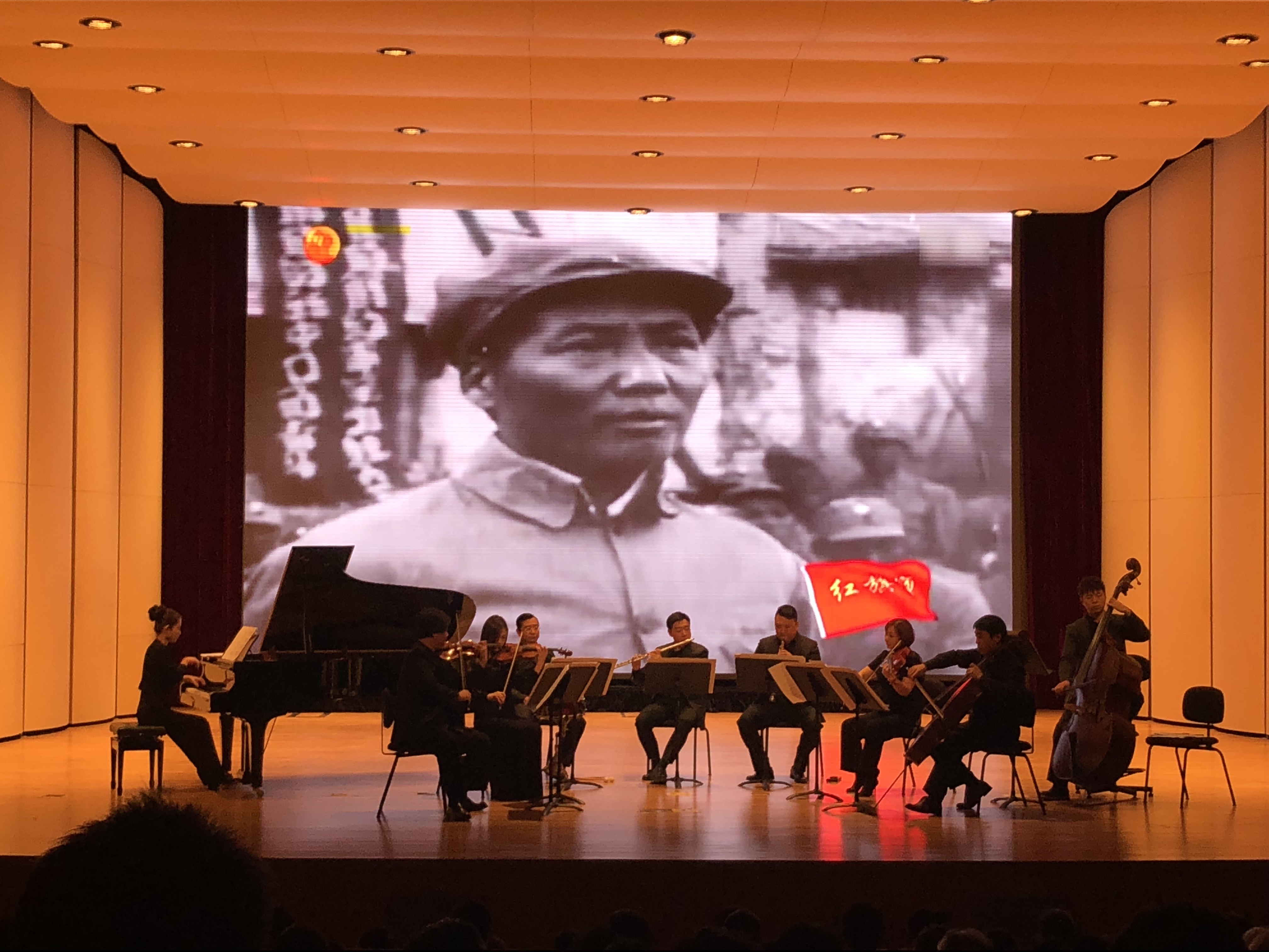 18时30分,支部成员相约音乐厅门口,经过简单的交流,有序进入场内,准备欣赏这场精彩的演出。音乐会主要以红色电影经典音乐为主,也包含了我国各地民歌及经典曲目,上半场从欢快的《太阳出来喜洋洋》开始,演出了经典曲目《阿波毛主席》、《万泉河水》、《我爱你中国》等;下半场则有《黄河钢琴协奏曲》、《红星歌》、《红旗颂》等经典曲目,演出人员为中国国家交响乐团M.E室内乐团(M.E ChamberEnsemble)的演奏家们。