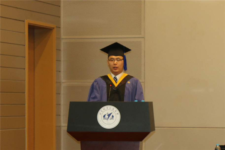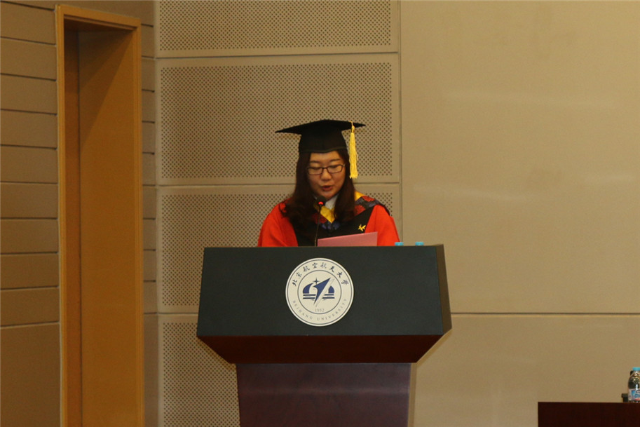 教师代表袁培江老师向毕业生送上了真诚的祝福,希望毕业生能够珍惜在北航的经历,珍惜作为北航学子的荣誉,在各行各业踏实发展,追逐梦想。硕士毕业生吴宏宇代表全体毕业生进行发言,表达了对母校、师长、父母亲人的感恩,对启航的憧憬,以及对母校、同学的祝福。